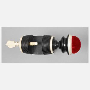 19. Jh., Ebenholz und Elfenbein, mehrteilig gedrechselt und montiert, tonnenförmiges Gestell mit Schraubzwinge zur Tischmontage, aufgesetztes plastisches Amphorenmotiv, welches das samtene Nadelkissen trägt, minimale Alters- und Gebrauchsspuren, H ca. 18 cm.