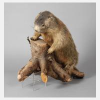 1. Hälfte 20. Jh., vollständig präpariertes Murmeltier mit eingesetzten Glasaugen, auf naturbelassenem Holzsockel, Altersspuren, H 40 cm.