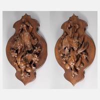 um 1900, Nussbaum massiv, aufwendig beschnitzt, wappenförmige Tafeln mit Eichenlaubdekor, darauf halbplastisch geformte, erlegte Wildvögel sowie jagdlicher Zierrat, etwas best., Altersspuren, H je ca. 90 cm.