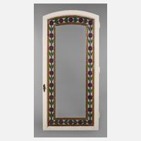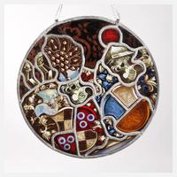 um 1900, zweiteilig, wohl Verglasung eines Möbels, in Messing gefasste facettgeschliffene Scheiben aus Klarglas, Feston aus mundgeblasenen Butzen und marmoriertem Farbglas, sehr guter Zustand, je 60 x 42 cm.