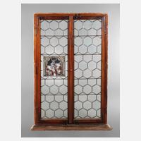 2. Hälfte 19. Jh., Rahmen aus massivem Nadelholz mit Fensterbank, zweiflügelig, mit Windbändern, mittig ein fein gemaltes Schmuckglas im Renaissancestil mit üppigem Wappen, seitlich je drei figürliche Darstellungen, links unten monogrammiert H. A., drei Segmente des Zierglases gerissen, H 149 x B 98 cm.