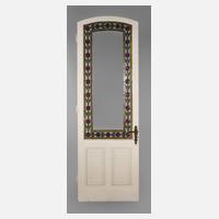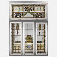 deutsch, um 1905, dreiflügeliges Fenster mit Oberlicht, ornamentaler Dekor aus Buntglas, partiell bemalt, einzelne Segmente beschädigt, rest.bed., Maße 215 x 148 cm.