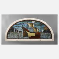 um 1905, segmentbogenförmiges Oberlicht mit Schiffsmotiv vor Felsenküste, in den Segeln gemalter Merkurstab, beschädigt, rest.bed., Maße 71 x 142 cm.