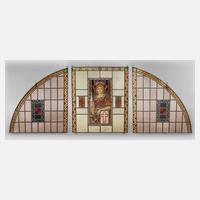 um 1900, dreiteiliges Oberlicht aus Buntglas mit feiner Malerei, mittig Darstellung einer Jugendstilschönheit, mit Kirchenturm und Kirchengrundriss, alle Teile mit nachträglicher Aufhängung versehen, ein Segment mit Riss, sonst guter Zustand, H max. 66 cm, B je 54 cm.