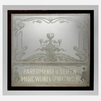 deutsch, um 1900, aus dem Schaufenster einer Wiesbadener Parfümerie, fein geätzter Floraldekor, der Schriftzug mit Farbe aufgetragen (entfernbar), in originalem Holzrahmen, Maße 98 x 102 cm.
