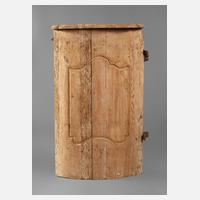 Mitte 18. Jh., Nadelholz massiv, leicht gebauchte Front mit geschnitzter Füllung, abgelaugt, mit Scharnier und einem Riegel, rest.bed., Maße 93 x 55 cm.