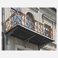 um 1890, Schmiedeeisen mit Resten alter Farbfassung, korrodiert, mit drei dazu passenden reich verzierten Konsolen aus Gusseisen und geöltem Dielenboden, dieser gut erhalten, Maße 103 x 340 x 115 cm,
