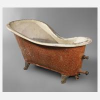 um 1860, freistehende Wanne aus Zinkblech, farbig glasiert, leicht verzierte Füße aus Eisenguss, eine Seite eingedellt, unrestaurierter Originalzustand mit Messingstöpsel, Maße 84 x 177 x 85 cm.