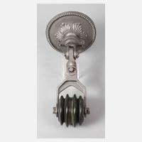 für einen elektrischen Hausanschluss um 1900, Rosette aus Eisenguss, daran schwenkbar gelagerte Umlenkrolle aus grün glasiertem Porzellan, restauriert, L 35 cm, D 17 cm.