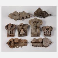 meist 18. Jh., bestehend aus drei Türschlössern, zwei Schrankschlössern und drei Truhenschlössern, unrestaurierter Zustand, mit Alters- und Gebrauchsspuren, teilweise rest.bed., L max. 37 cm.
