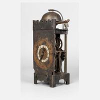 Deutschland, um 1600, einzeigerig, mit Stundenschlag auf obenliegende Glocke, Spindelhemmung mit Waagunruh, Antrieb über zwei Gewichte mit Schnurzug, Werk restauriert mit Ergänzungen, gehfähig, Stuhl, Gewichte und Schnüre fehlen, H 30 cm, B 10,5 cm T 9 cm.
