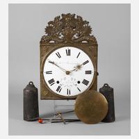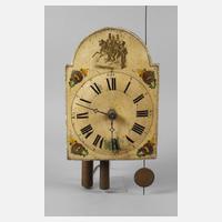 Schwarzwald, um 1820, Holzplatinenwerk mit drei Gewichten und Viertelstundenschlag auf zwei Tonfedern, gewölbtes Holzschild mit militärischem Motiv und Blumenmalerei verziert, unrestaurierter Originalzustand, ein Gewicht und Kette fehlen, Gehwerk läuft, Schlagwerk reparaturbedürftig, Höhe Schild 34 cm.