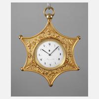 Frankreich, um 1800, auf Ziffernblatt gemarkt Brequet & Fils, reich verziertes sternenförmiges Gehäuse aus vergoldeter Bronze, von einer Kordel gerahmt, aufgelegter Dekor mit Medusenhaupt, Palmetten und Füllhörnern, rückseitig unter verschraubter Deckelplatte alt ergänztes Taschenuhrenwerk mit Spindelgang, ungemarkt, funktionstüchtig, Zeiger für Datumsanzeige fehlt, Länge 23 cm.