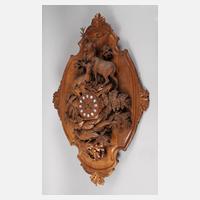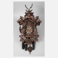 Schwarzwald, um 1900, fein geschnitztes Gehäuse verziert mit Rebhuhn und Hase, Jagdgewehr, Jagdtasche und Pulverhorn, die Bekrönung mit geschnitztem Hirschkopf, Werk mit Viertelstundenschlag, Auslösung von Kuckuck und Wachtel, 3 Gewichte, funktionstüchtig, Werk überholt, in gutem Zustand, Höhe 68 cm.