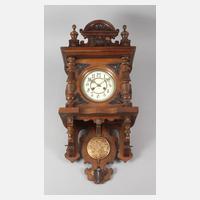Schwarzwald, 2. Hälfte 19. Jahrhundert, mit Eichenlaub verziertes Gehäuse, Werk mit 2 Aufzügen und Halbstundenschlag, oberhalb des Ziffernblattes drei geschnitzte und farbig gefasste Turner mit beweglichen Armen, welche sich bei geöffneter Tür bewegen, (Drahtgestell verbogen), etwas reparaturbedürftig, ein Zeiger ergänzt, sonst funktionstüchtig, Höhe mit Pendel 53 cm.