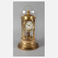 um 1900, auf Werkplatine gemarkt “Jahresuhren-Fabrik GmbH Germany", Gehäuse in Form eines Pavillons aus vergoldetem Messing, mit originalem Glassturz, makelloses Emailziffernblatt mit farbigen Girlanden verziert, funktionstüchtig, mit Schlüssel, Oberfläche mit Altersspuren, Höhe 42 cm.