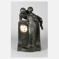 um 1900, gemarkt Keramische Kunstwerkstätte Schön & Co. Niederlößnitz bei Dresden, rückseitig signiert R. Schmotz, Entwurf Rudolf Schmotz (1884–1965), Keramik dunkelgrün glasiert, partiell poliert, Pendulenwerk gemarkt Junghans, funktionstüchtig, gute Erhaltung, mit Schlüssel, H 42 cm.
