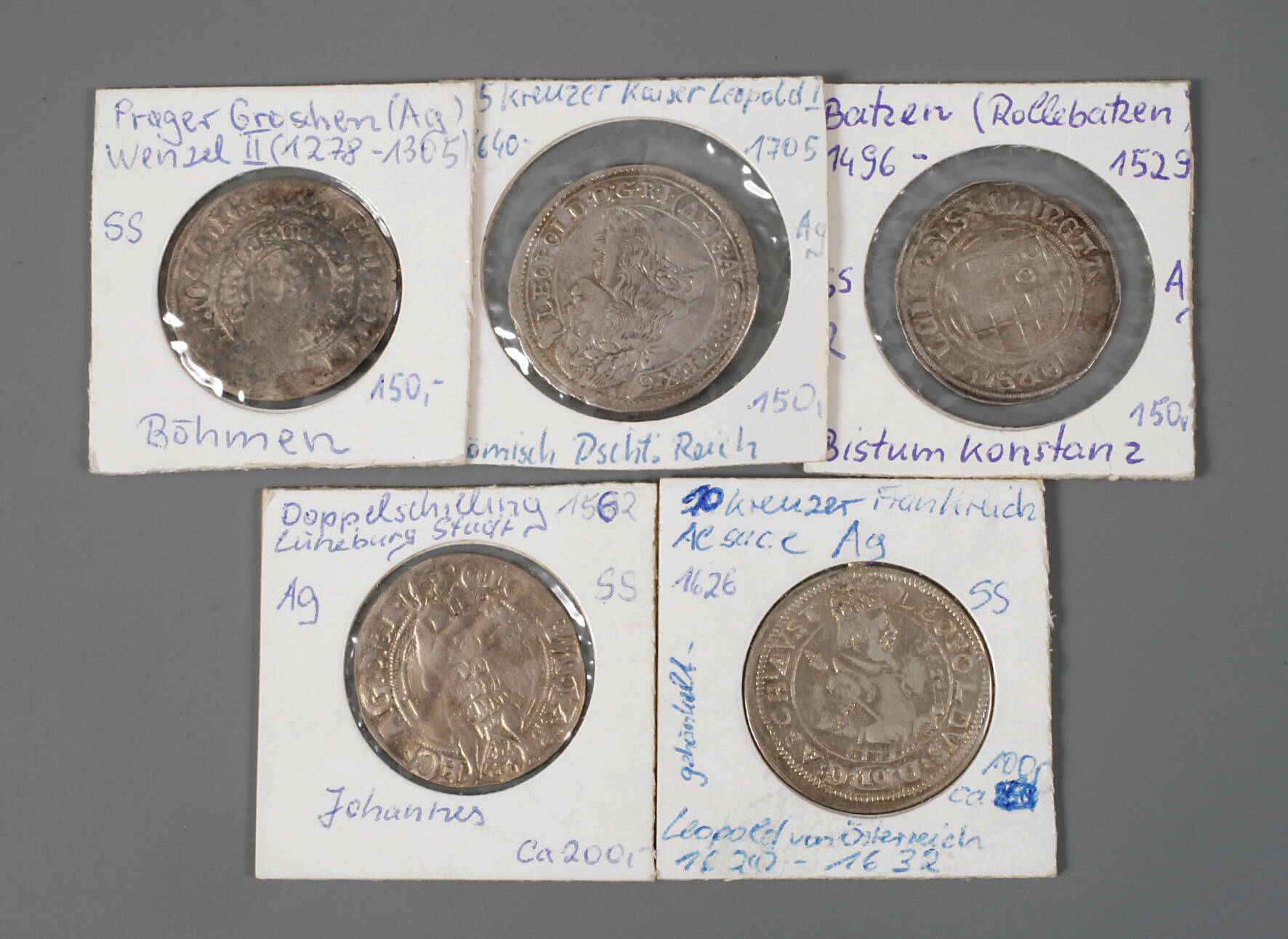 bestehend aus 5 Münzen, je ss: Prager Groschen Wenzel II. (1278–1305). –Rollbatzen Bistum Konstanz (1496–1529. – Doppelschilling Stadt Lüneburg 1562. – 10 Kreuzer Erzherzog Leopold V., Hall, 1626. – 15 Kreuzer Leopold I. 1681.