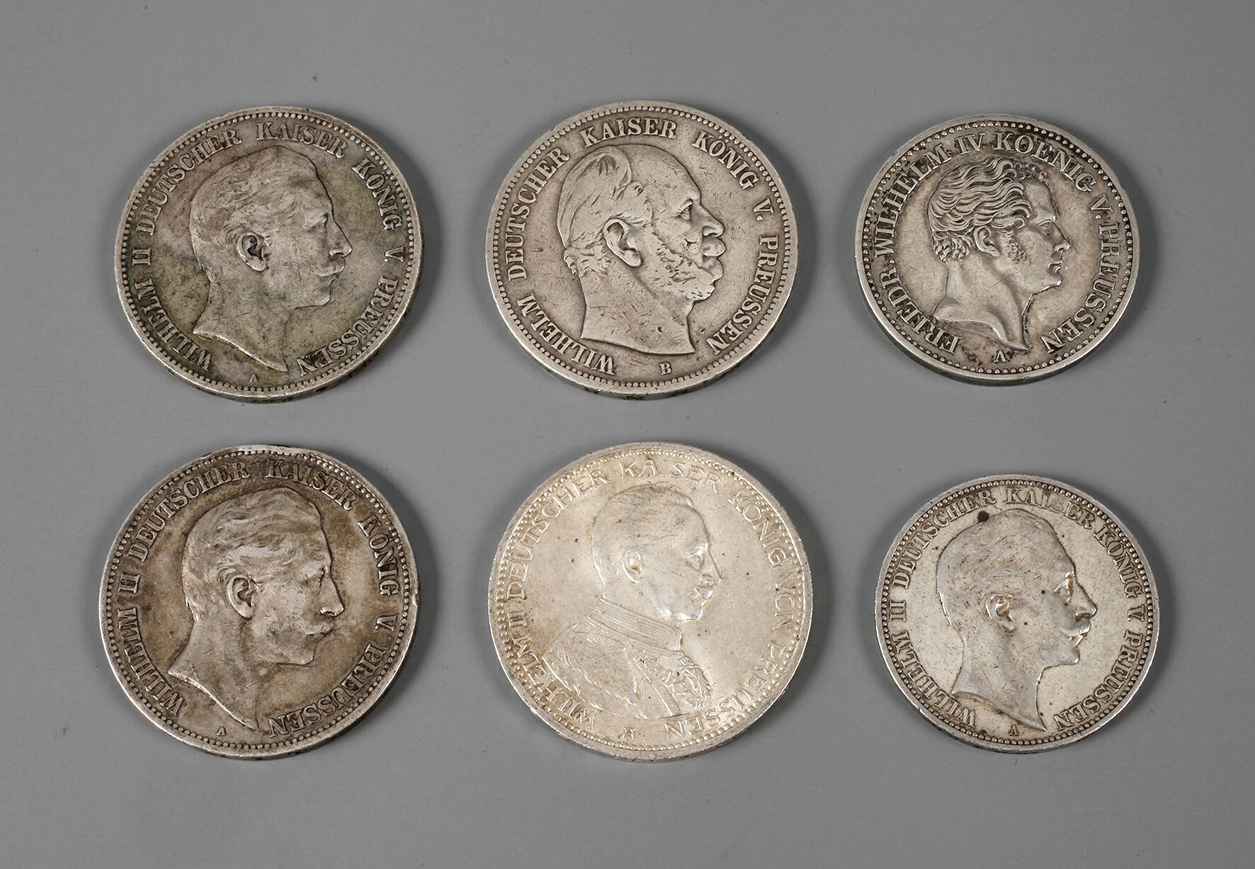 5 Mark 1876, 5 Mark 1899, 5 Mark 1913, 3 Mark 1910, 5 Mark 1900 (Randschlag), jeweils Umlaufspuren, dabei Taler 1841 Segen des Mansfelder Bergbaus, fast vz.