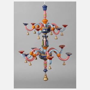 Erzgebirge Anfang 20. Jh., Holz gedrechselt und pastellfarben handlackiert, als steckbarer Hängeleuchter mit Balusterschaft, vier plastischen mittig umlaufend angeordneten Figuren, zwölf s-förmig gebogenen Leuchterarme mit je einer Kerzentülle und insgesamt 13 abgehängten Glocken, Alters- und Gebrauchsspuren, Farbfassung alt übergangen, L max. 50 cm, B 33 cm.