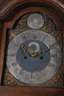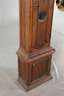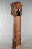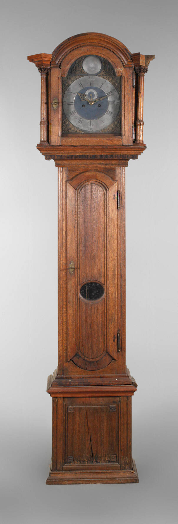 Eiche massiv, auf Ziffernblatt datiert, schlankes dreiteilige Gehäuse mit fein kannelierten Kassettenfüllungen, Kopfteil mit ausgestellten Vollsäulen, Metallziffernblatt teils blau gefasst, mit römischen Ziffern und arabischer Minuterie, kleine Sekunde, zwei Gewichte an Darmsaiten, Halbstundenschlag auf Glocke, Pendelfeder fehlt, etwas rest.bed., H 227 B 50 T 28 cm.