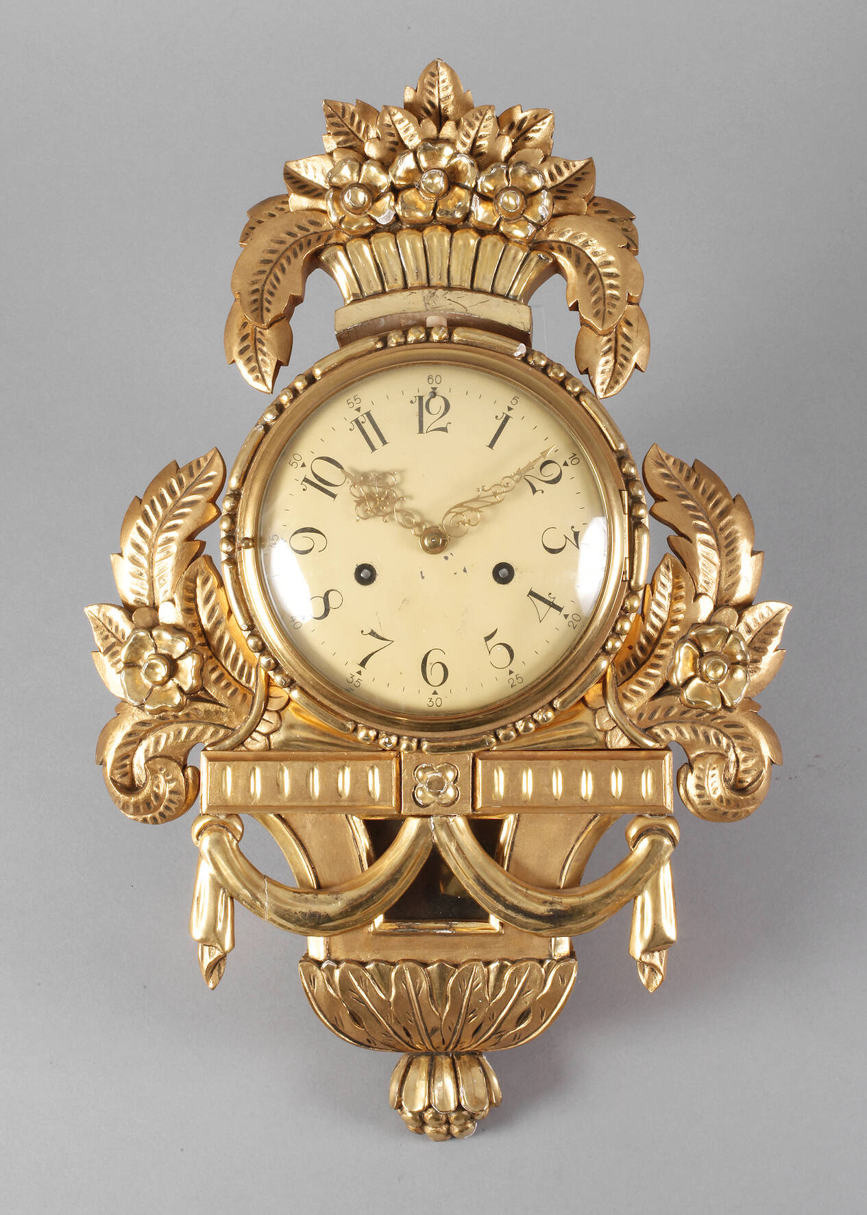 Schweden, Anfang 20. Jahrhundert, Holz geschnitzt und vergoldet, Metallziffernblatt mit arabischen Ziffern und Minuterie, Pendulenwerk mit Halbstundenschlag auf Glocke, funktionstüchtig, ein Zierteil lose, H 52 cm.