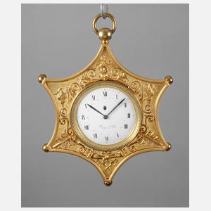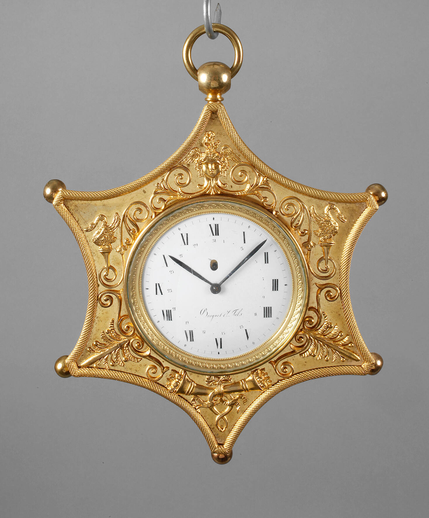 Frankreich, um 1800, auf Ziffernblatt gemarkt Brequet & Fils, reich verziertes sternenförmiges Gehäuse aus vergoldeter Bronze, von einer Kordel gerahmt, aufgelegter Dekor mit Medusenhaupt, Palmetten und Füllhörnern, rückseitig unter verschraubter Deckelplatte alt ergänztes Taschenuhrenwerk mit Spindelgang, ungemarkt, funktionstüchtig, Zeiger für Datumsanzeige fehlt, Länge 23 cm.