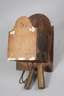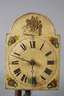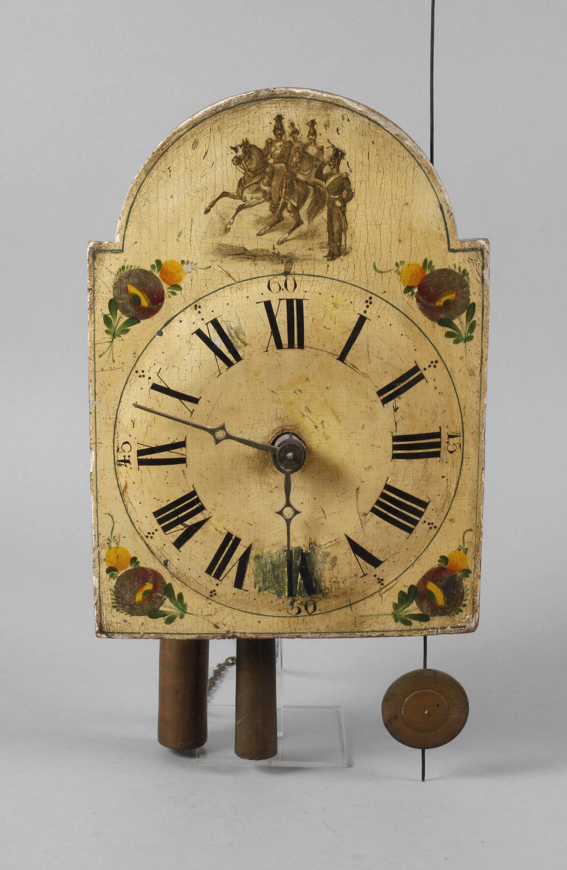 Schwarzwald, um 1820, Holzplatinenwerk mit drei Gewichten und Viertelstundenschlag auf zwei Tonfedern, gewölbtes Holzschild mit militärischem Motiv und Blumenmalerei verziert, unrestaurierter Originalzustand, ein Gewicht und Kette fehlen, Gehwerk läuft, Schlagwerk reparaturbedürftig, Höhe Schild 34 cm.