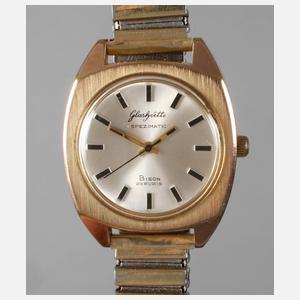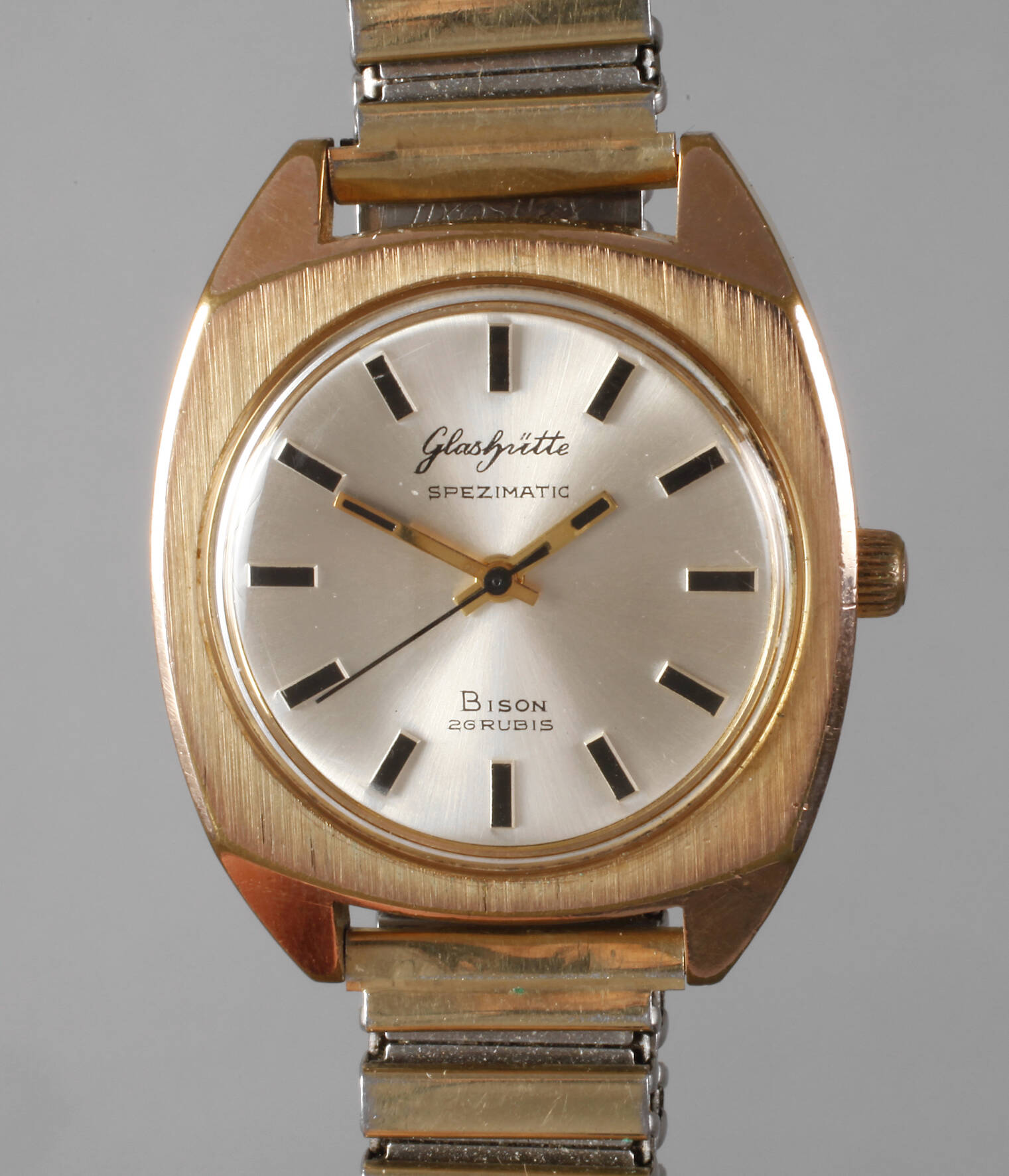 um 1970, Modell Bison, vergoldetes Gehäuse mit Edelstahlboden, Gehäusenummer 017991, Automatikwerk mit Zentralsekunde, funktionstüchtig, an Gliederzugarmband, Z 2, Durchmesser 35 mm.