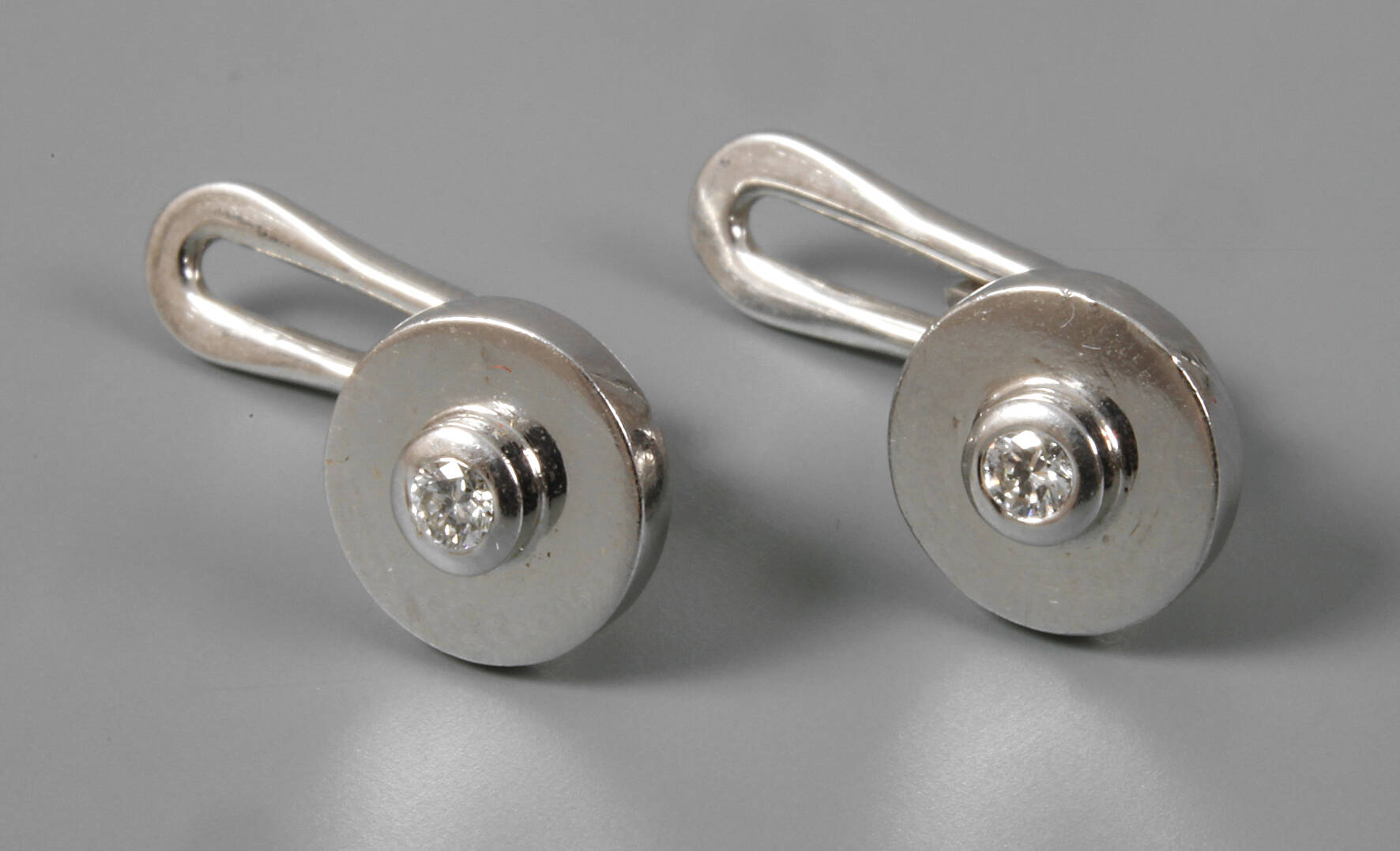 Ende 20. Jh., Weißgold gestempelt 750, jeweils besetzt mit einem Brillanten von ca. 0,05 ct in Zargenfassung, D Kopf ca. 9 mm, G gesamt ca. 5,6 g.