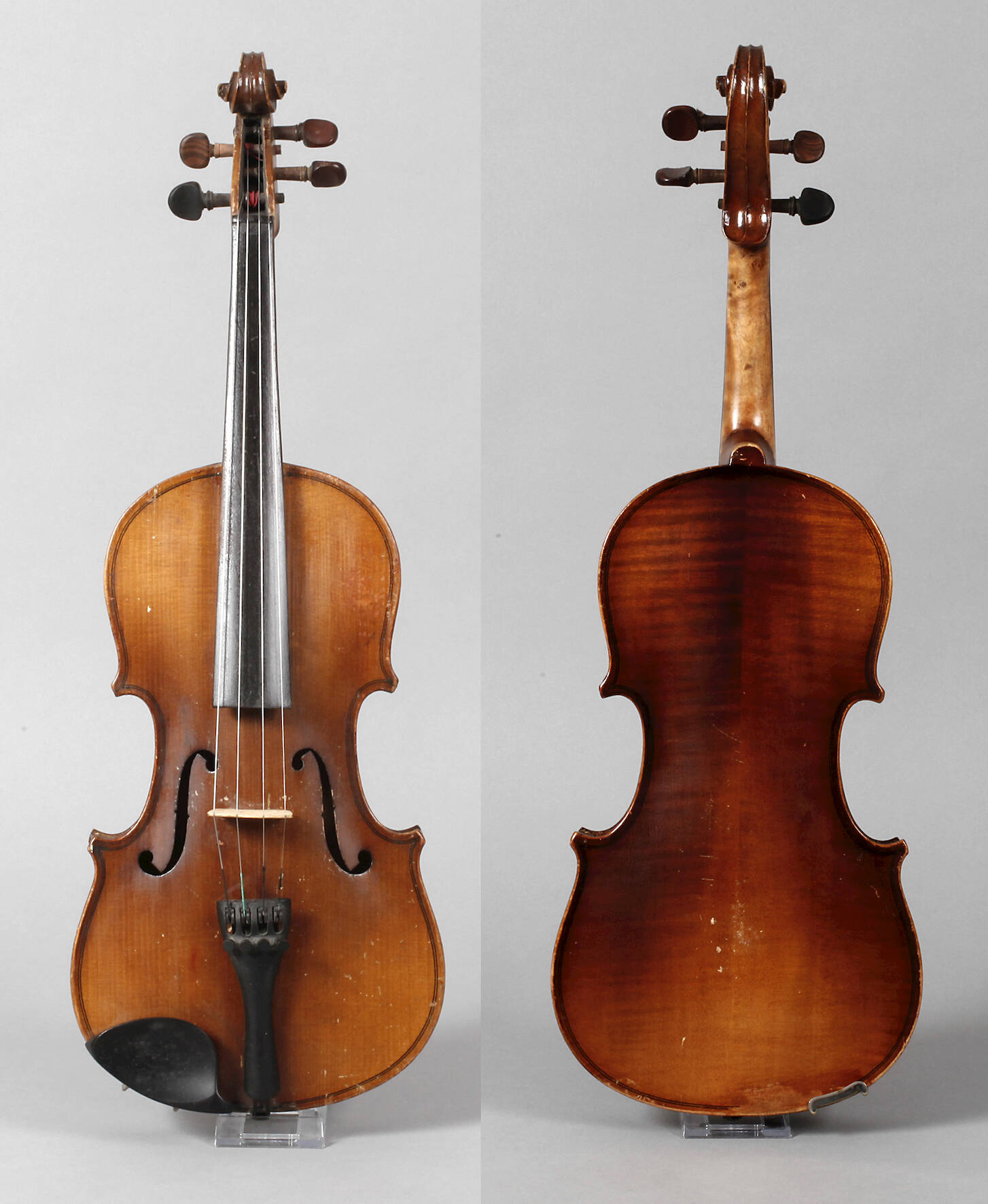 Anfang 20. Jh., mit Modellzettel Josef Guarnerius fecit Cremonae anno 1765, geteilter, leicht geflammter Boden, in braunem Lack, stärker gewölbte Decke mit kleineren Rissen, restaurierungsbedürftig, mit defektem Bogen, im Etui, L Korpus 35,6 cm.