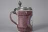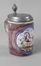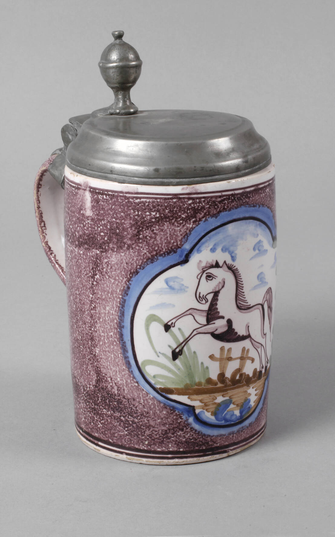 Ende 18. Jh., Walzenkrug aus beigefarbenem Fayencescherben, weißlich glasiert, manganfarben jaspiert, schauseitig eine Kartusche mit springendem Pferd in Landschaft, übergreifender Zinndeckel mit Kugelrast, innen drei ungedeutete Punzen, am Lippenrand und am Henkel minimalste Fehlstellen, Deckel mit winzigstem Einriss, insgesamt guter altersgemäßer Zustand, H 22 cm.