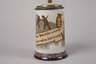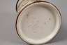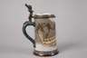 Zinnfassung mit Widmung 1893, Prägemarke V & B Mettlach, Schriftzug gegen Nachbildung geschützt, Modellnummer 2092, cremefarbenes Feinsteinzeug geritzt und matt bemalt, signiert "Heinrich Schlitt", partiell glasiert und vergoldet, Spruchband: "Rechter Hand, linker Hand, beides vertauscht' Strasse, ich merk' es wohl du bist berauscht.", Zwerg als Drücker, innen etwas glasurunterlaufen, sonst guter Zustand, H 19,5 cm.