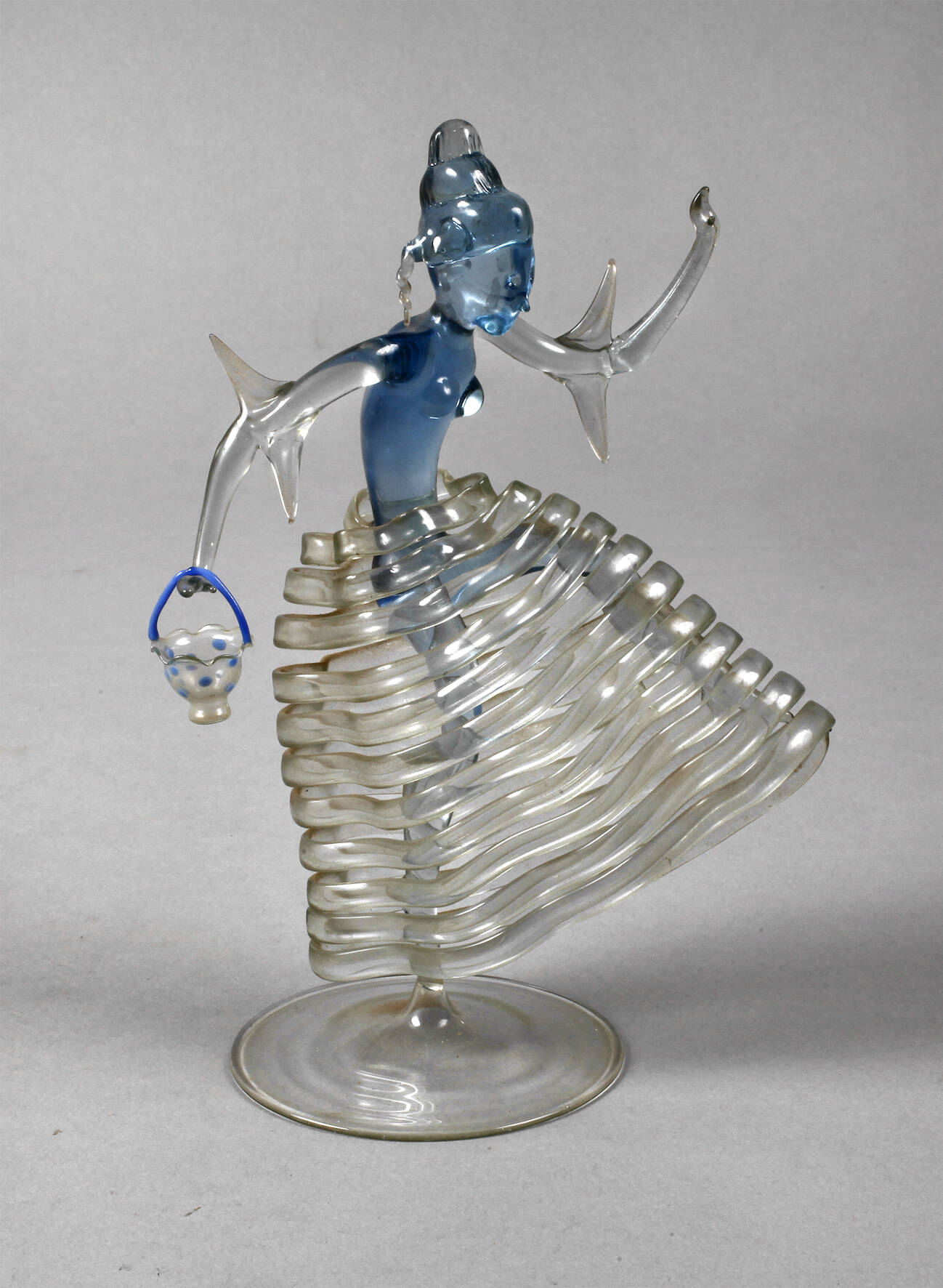 1930er Jahre, farbloses und hellblaues Glas vor der Lampe geblasen, Tänzerin in Pose mit Reifrock, an der Hand ein abnehmbares (ergänztes?), Körbchen, guter Zustand, H 21 cm, Quelle: Webseite Hüttentechnische Vereinigung der Deutschen Glasindustrie (HVG), Museum für Glaskunst Lauscha.