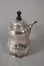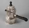 1. Hälfte 18. Jh., Dresdner Stadtmarke mit Silbergehalt 12 Lot, Meisterpunze JGS für Johann Georg Süßt, Meister ab 1703-1749, weiterer Buchstabe p und Tremulierstrich, verziert mit getriebenen Rocaillen, Muscheln, Blattwerk und Blüten, fein geschnitzte Ebenholzhenkel, abnehmbarer Deckel, sehr guter altersgemäßer Zustand, H 16,5 cm, G ca. 322 g.