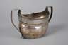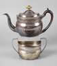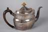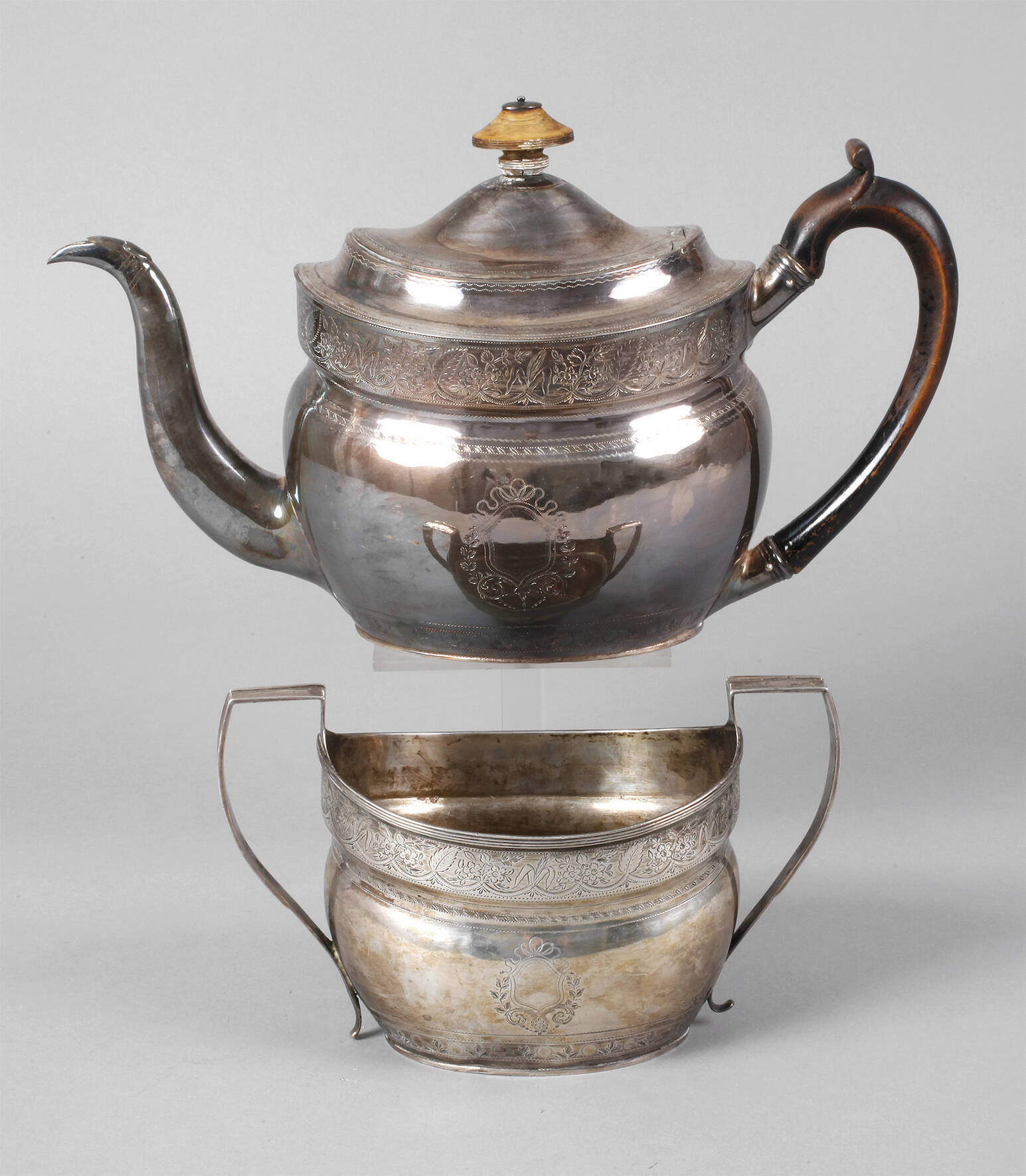 gepunzt Alexander Field, um 1800, Jahreszeichen F, Leopardenkopf für London und Lion Passant, ovale Form, mit geätztem und graviertem klassizistischen Dekor, Kanne mit rückseitig scharniertem Klappdeckel, schlankem Ausguss sowie gedrechseltem und geschwärztem Holzgriff, geschraubter Holzknauf, dieser verblichen und mit Altersrissen, Henkelschale innen mit Resten alter Vergoldung, Gebrauchs- und Altersspuren, L 20 cm und 31 cm, G zus. ca. 726 g.