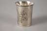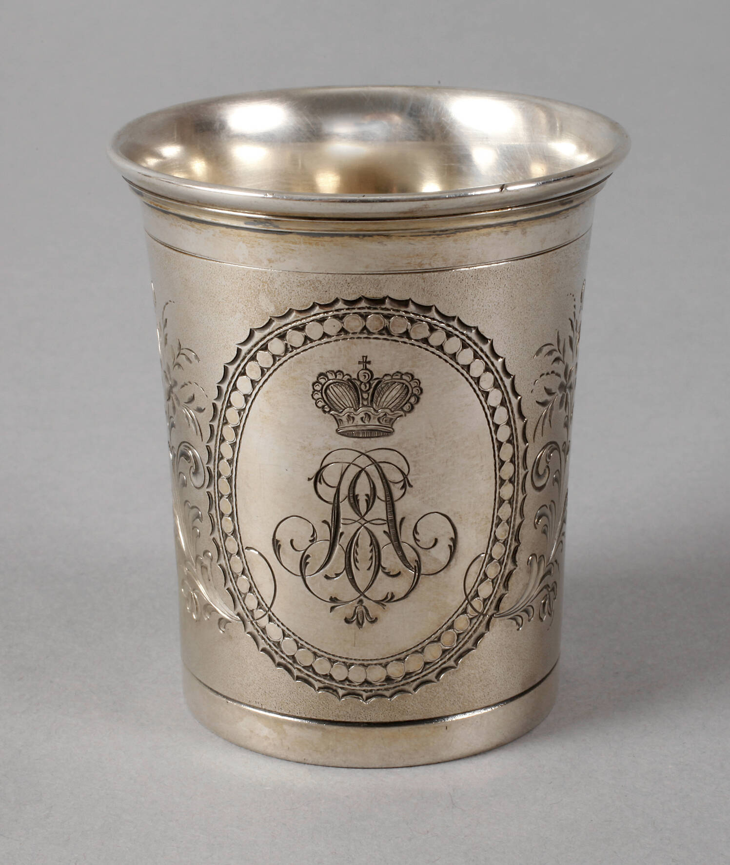 Mitte 19. Jh., gestempelt 13 Lot, Meisterpunze "CD", leicht konisch mit feiner Punzierung und schauseitiger Gravur, Besitzermonogramm A mit Krone, im Ornamentkranz mit seitlichen Blütensträußen, innen Reste alter Vergoldung, normale Altersspuren, H 7 cm, G ca. 75,6 g.