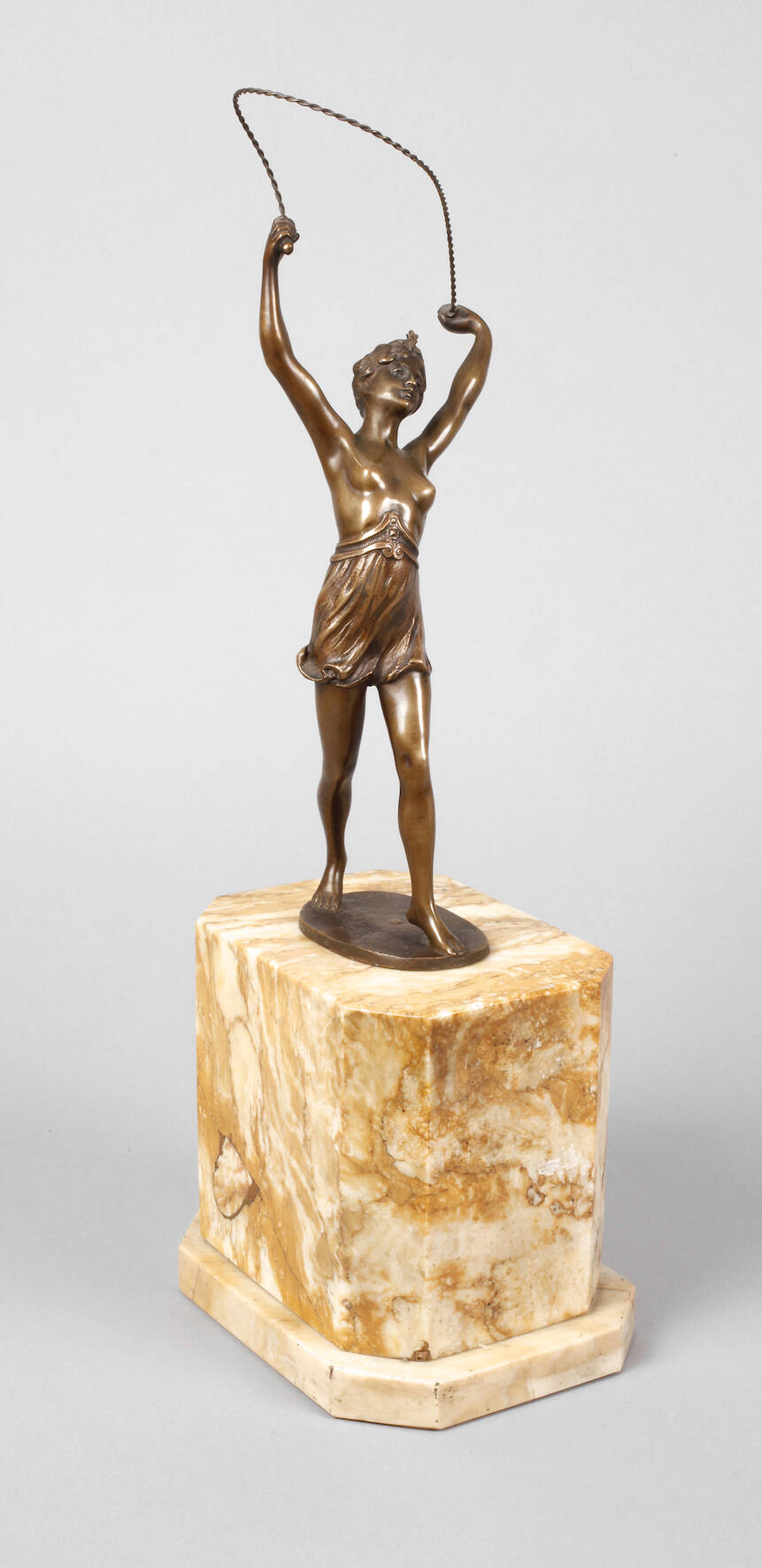 um 1910, unsigniert, Bronze nuanciert hellbraun patiniert, Seiltänzerin als Halbakt in eleganter Pose mit über den Kopf geschwungenem Seil, lediglich mit einem kurzen Rock bekleidet, die Haare elegant aufgesteckt und der Kopf mit einer Tiara bekrönt, auf kleiner ovaler Plinthe, auf mehrteiligem hohen Marmorsockel, H Bronze ca. 30,7 cm, H gesamt ca. 46 cm.