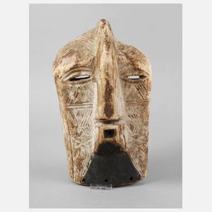 Kongobecken, 2. Hälfte 19. Jh., der Volksgruppe der Songye zugeordnet, farbig gefasste Maske aus weichem Tropenholz, bis auf das Mittelteil mit Kerbschnitzereien verziert, berieben, partiell größere Ausbrüche, Alters- und Gebrauchsspuren, H 32 cm.