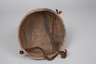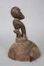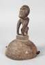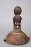 Ghana, 20. Jh., der Volksgruppe der Ashanti zugeordnet, halbrunde Holzschale mit geflochtener Trageschnur, darüber aufsitzender, vollplastischer Affe, etwas verkrustet, Alters- und Gebrauchsspuren, H 25 cm.