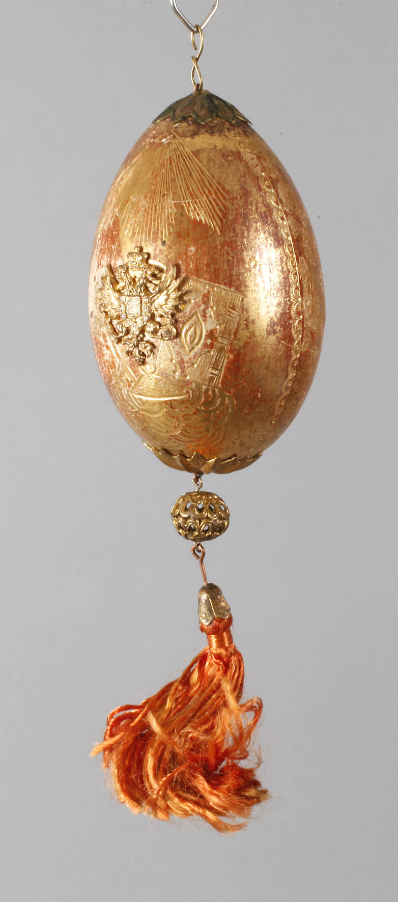 um 1900, Holz mit hellem Kreidegrund, rotem Bolus und Blattvergoldung, handgraviert, Monogramm XB, aufgelegter vergoldeter Doppeladler aus Messing, beidseitig Rosetten, kugelige Abhängung mit Quaste, Aufhängung fehlt, Vergoldung etwas berieben, L total 17 cm.