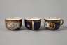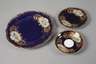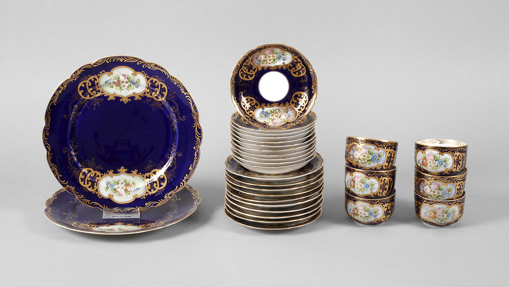 vor 1891, Firma Gardner Moskau, roter Stempel mit Georg dem Drachentöter und Doppeladler, Porzellan mit kobaltblauem Fond, mit polychrom bemalten Kartuschen und reicher Goldmalerei, Blütenranken und Ornamentik, zwei Kuchenteller, zehn Teller, elf Untertassen und sechs Tassen, Vergoldung teilweise etwas berieben, leichte Gebrauchsspuren, D max. 25,5 cm.