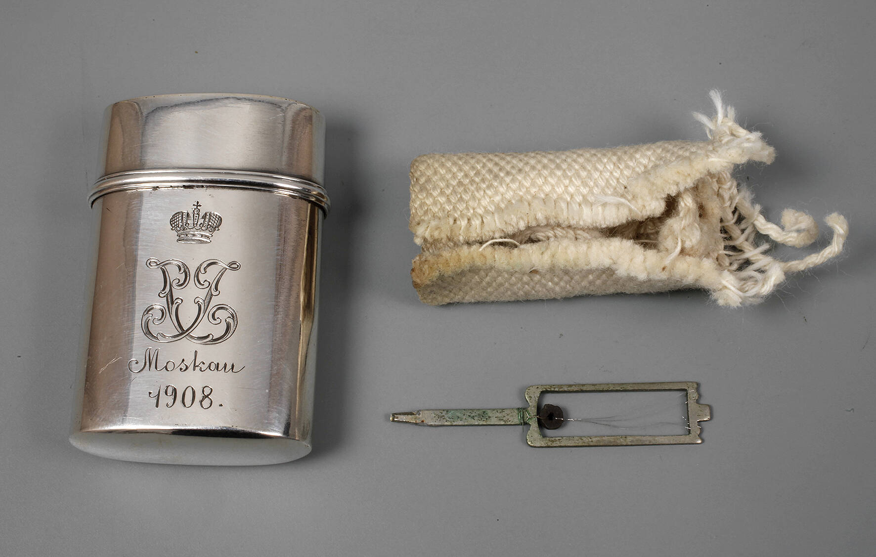 datiert Moskau 1908 mit Monogramm und Krone, Silber gestempelt 84 Zolotniki, Herstellerpunze Karl Fend (Fent), tätig 1883–1908, innen vergoldetes Feuerzeug mit Docht, Hülse mit zwei Behältern, in einem die Platindrähte, welche am Deckel befestigt sind, im anderen der Docht, der mit Alkohol getränkt wurde, beim Eintauchen der Platindrähte begannen diese zu glühen und entzündeten den Docht, ungebraucht, H 5 cm, G ca. 30 g.