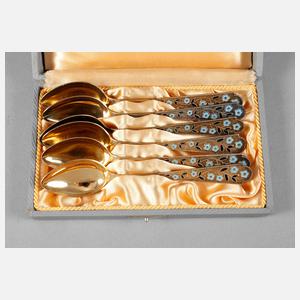 2. Hälfte 20. Jh., Silberstempel 875 sowie Herstellermarke, vergoldet, die Griffe schauseitig in Blau und Schwarz emailliert, verziert mit Blütenranken, ungebraucht, im originalen Etui, G ca. 131 g.