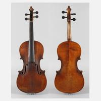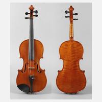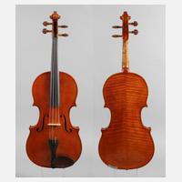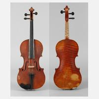 um 1900, mit Modellzettel Antonius Stradivarius Cremonensis 1725, geteilter, kaum geflammter Boden im haselnussbraunen Lack, mit umlaufender dreiteiliger Randeinlage, Decke und Boden mit verfestigter Rissbildung, rest.bed., mit defektem Bogen im Etui, L Korpus 38,5 cm.