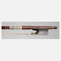 mit Klebezettel Johann George Lippold Neukirchen bey Adorf 1853, geteilter, gleichmäßig geflammter Boden, in ziegelrotem Lack, charakteristisch ist der rechte C-Bügel ein wenig höher, Gebrauchsspuren, beigegeben Bogen Max Bergmann, mit erneuerter Bespannung, im Etui, L Korpus 35,7 cm, B Oben 16,8 cm, B Mitte 11,2 cm, B Unten 20,9 cm.