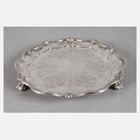 gestempelte Registriermarke, "Lion Passant", Leopardenkopf für London und Modellnr. 7868, geschweifte, perlbandverzierte Platte, auf drei Kugeln tragenden Krallenfüßen, fein ziselierter Floraldekor, guter altersgemäßer Zustand, D 22 cm, G ca. 363 g.