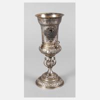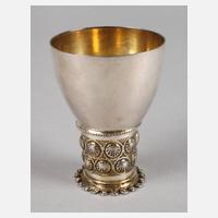 wohl Kitzingen/Bayern, 18. Jh. oder früher, gepunzt "K" und "GE" im Wappen, Silber fein punziert und innen vergoldet, leicht konisch mit Rillenverzierungen, sehr schöner unrestaurierter Originalzustand, H 8,5 cm, G ca. 107 g. Quelle: Punzenvergleiche Marc Rosenberg, Der Goldschmiede Markenzeichen, Bd. 2, S. 183 Nr. 2672 und 2674.