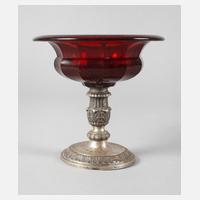 um 1860, gestempelt 13 Lot, unleserliche Herstellermarke, fein getrieben und verziert mit Palmetten und Lorbeerlaub, der Aufsatz aus rubinrotem, geschliffenem Glas, am Stand etwas gedellt, sonst normale Alters- und Gebrauchsspuren, H 16 cm.