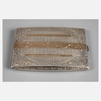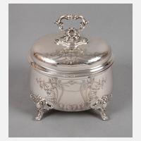 Ende 19. Jh., gestempelt Halbmond, Krone, 800, Herstellermarke Bruckmann & Söhne Heilbronn, Modellnr. 4037B, Silber innen vergoldet, reich verziert mit historisierenden Motiven, auf vier ausgestellten Füßen, rückseitig scharnierter Klappdeckel, mit blattverziertem Griff, gravierter Alpenveilchendekor, sehr schöner Originalzustand, H 15 cm, G ca. 280 g.